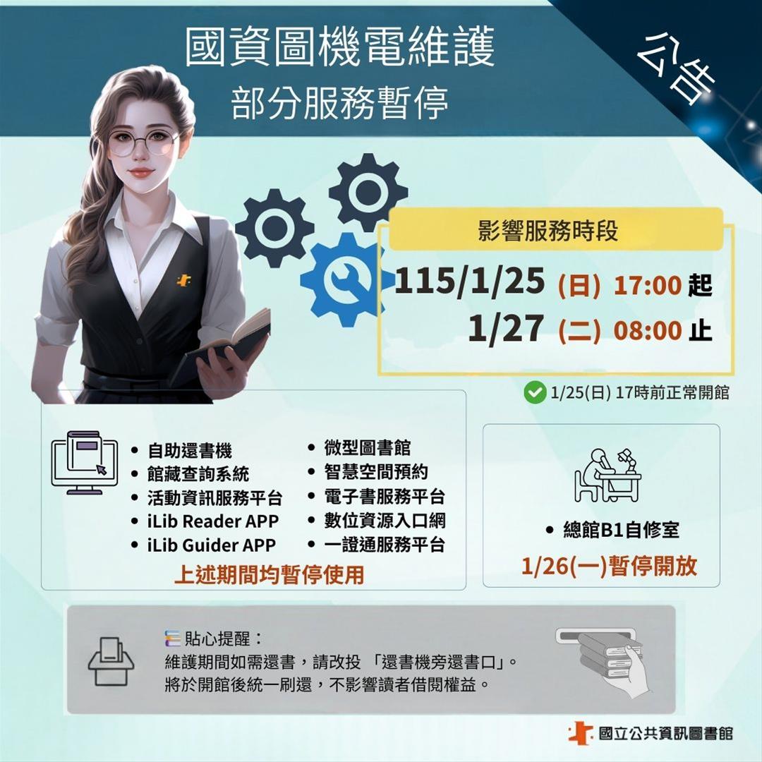 115年1月25日至27日總館因機電設備維護作業,部分服務暫停使用通知