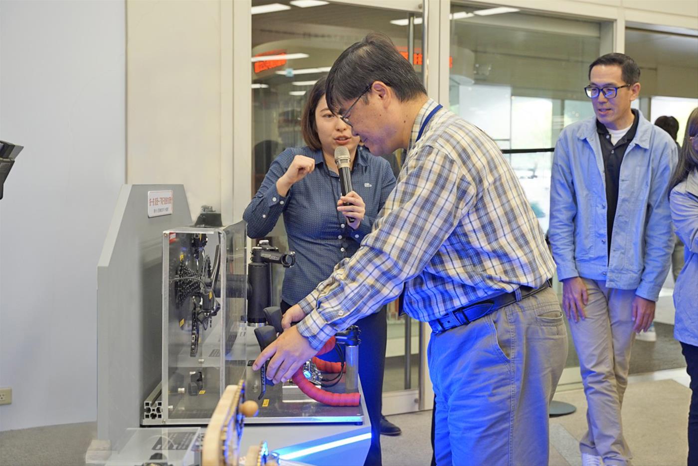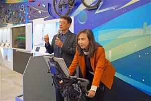 《小零件・大世界》特展開幕 邀請民眾動手玩自行車,國資圖馬湘萍館長(右)試騎體驗(左)為汪總監