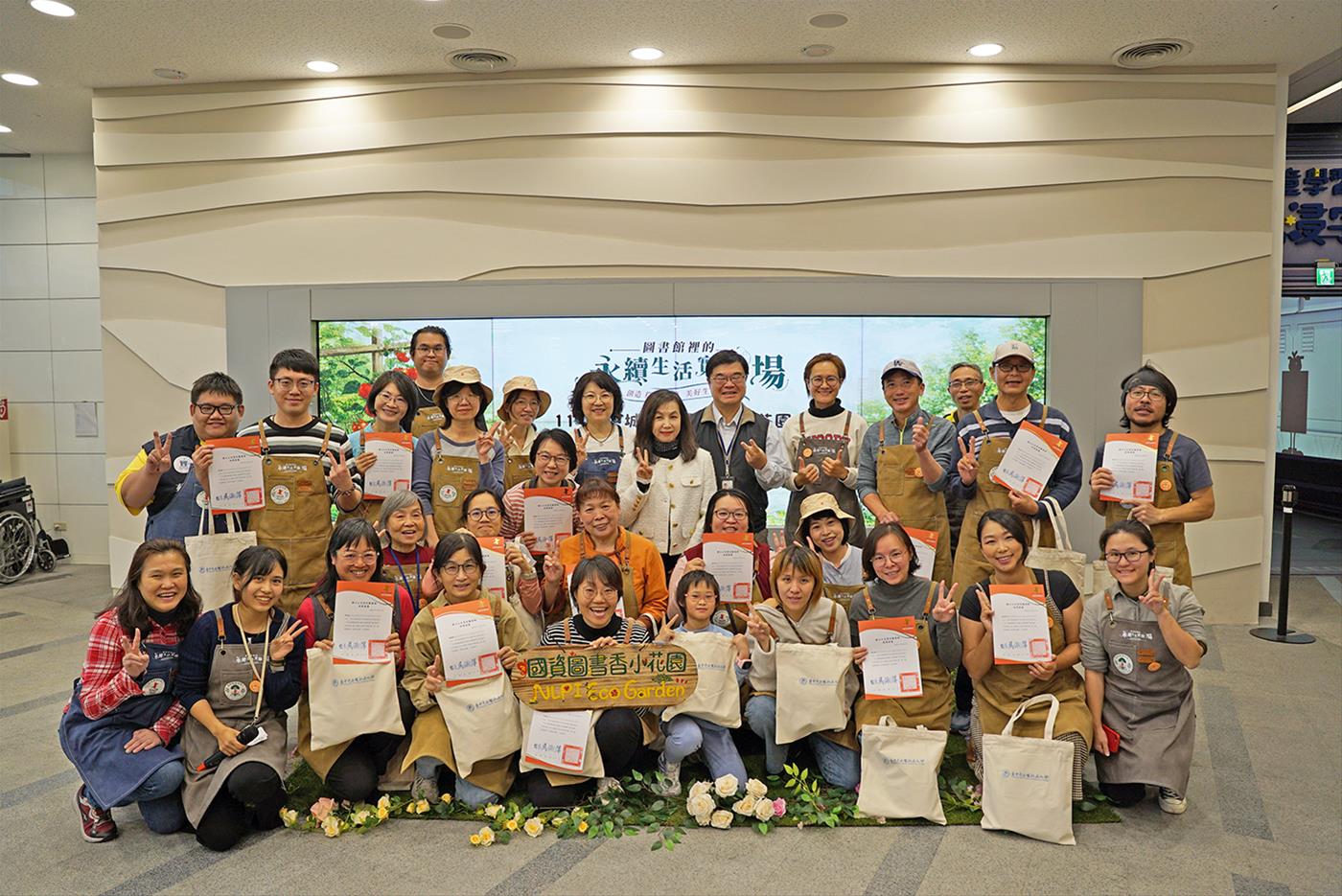 國資圖指出,「圖書館裡的永續生活實驗場」核心概念源於圖書館對公共議題的長期關注,希望透過「種土、種人、種知識」結合閱讀推廣、環境行動與社群參與,回應氣候變遷、生態保育與永續生活等議題,並呼應聯合國永續發展目標(SDGs),計畫亦融入樸門永續設計「照顧地球、照顧人、分享多餘」的核心精神,讓永續不僅停留在理念,而能透過實作走入日常。本次成果展最後也在老師學員見證下,由馬湘萍館長、廖淑珠主任共同為「書香小花園」掛牌,象徵計畫圓滿落實,為第一期學員的努力與花園建立正式認可,完美收尾。