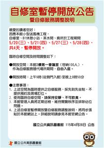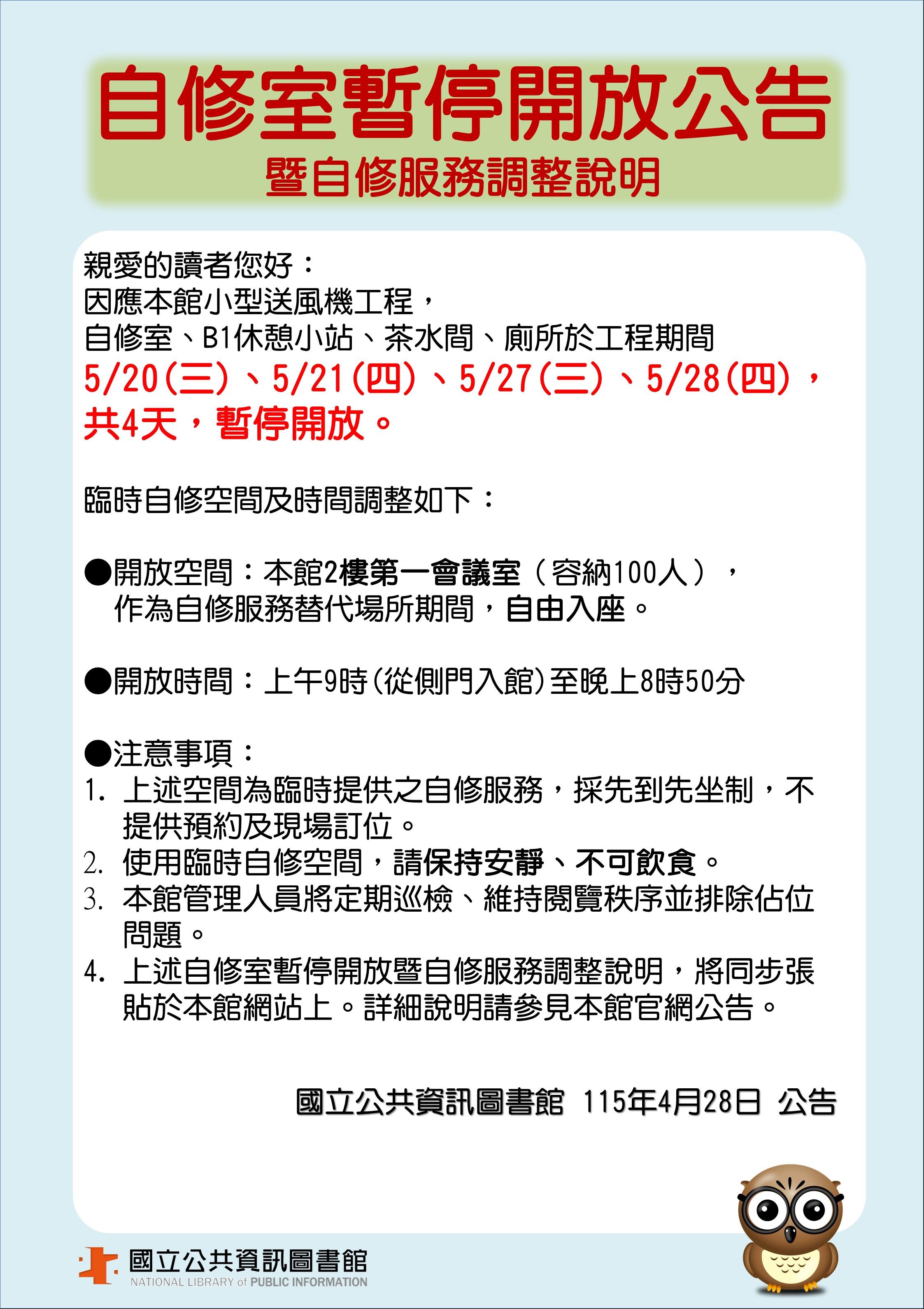 115年5月份總館自修閱覽室暫停開放公告 暨 自修服務調整說明