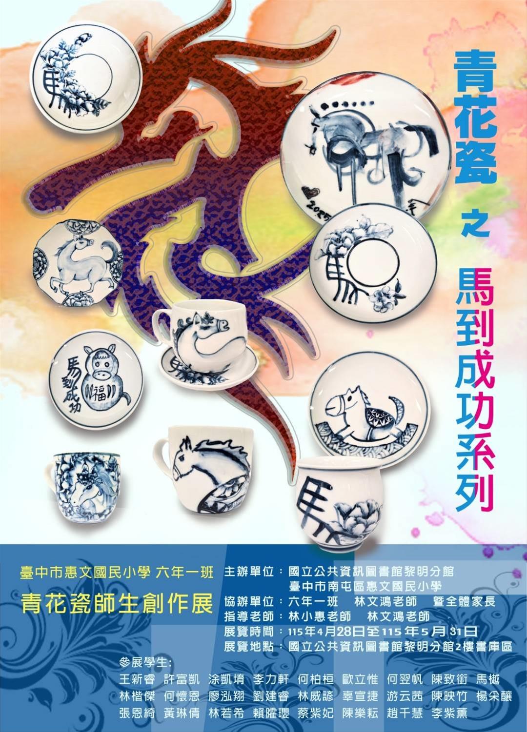 國立公共資訊圖書館攜手臺中市南屯區惠文國民小學,共同舉辦「青花瓷之馬到成功系列師生創作展」,展期自115年4月28日至5月31日止,於國資圖黎明分館2樓書庫區展出,邀請民眾走入圖書館閱讀空間,在書香與藝術交織之中,感受傳統青花瓷工藝與生肖文化融合的創作魅力。