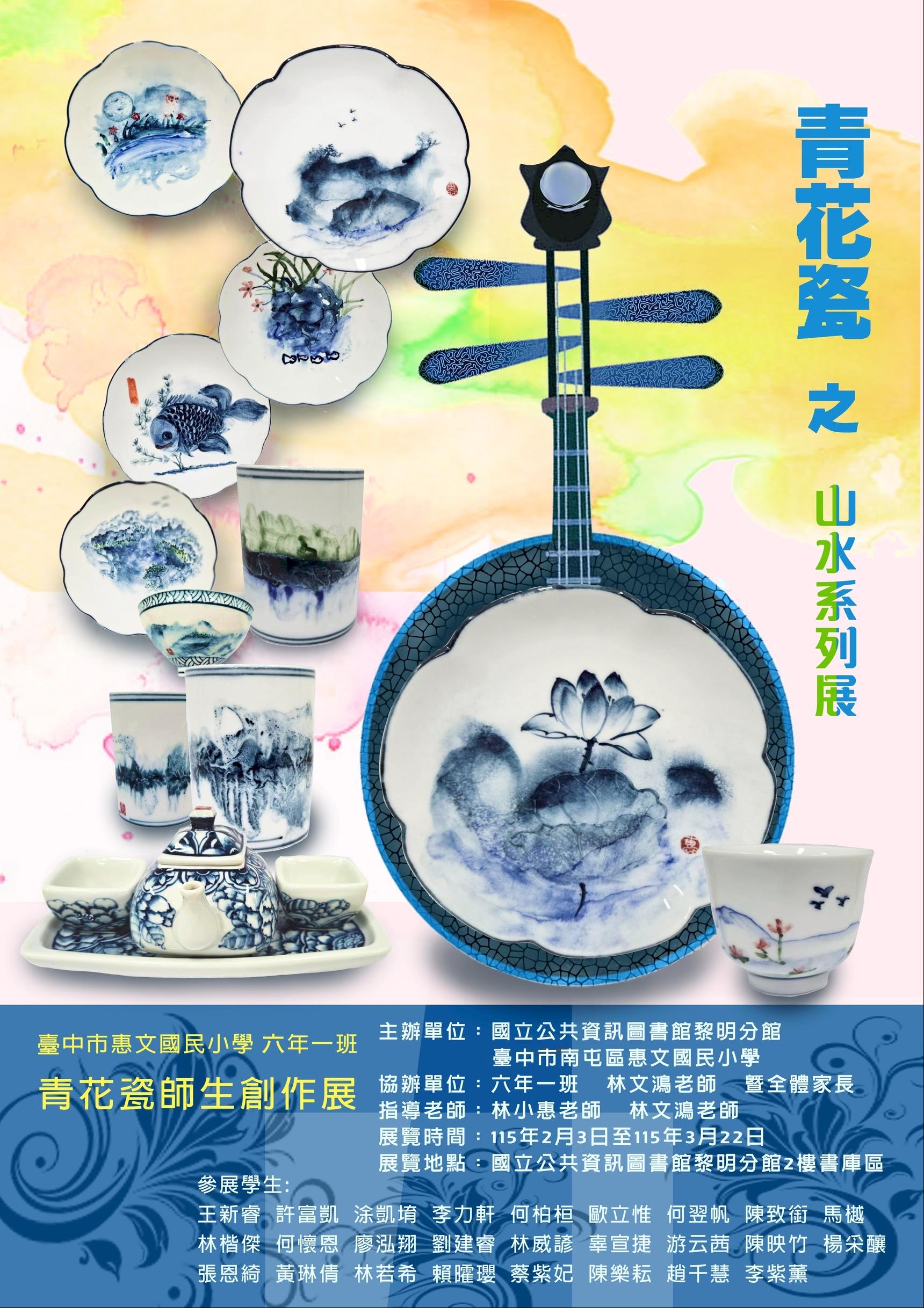 國資圖表示,本次展覽以「山水系列」為主題,在惠文國小洪誌敬校長支持下,由青花瓷藝術家林小惠老師及惠文國小601班導師林文鴻老師共同指導學生,將傳統水墨山水意境轉化為青花瓷創作元素,展現校園藝術教育與傳統文化傳承成果。