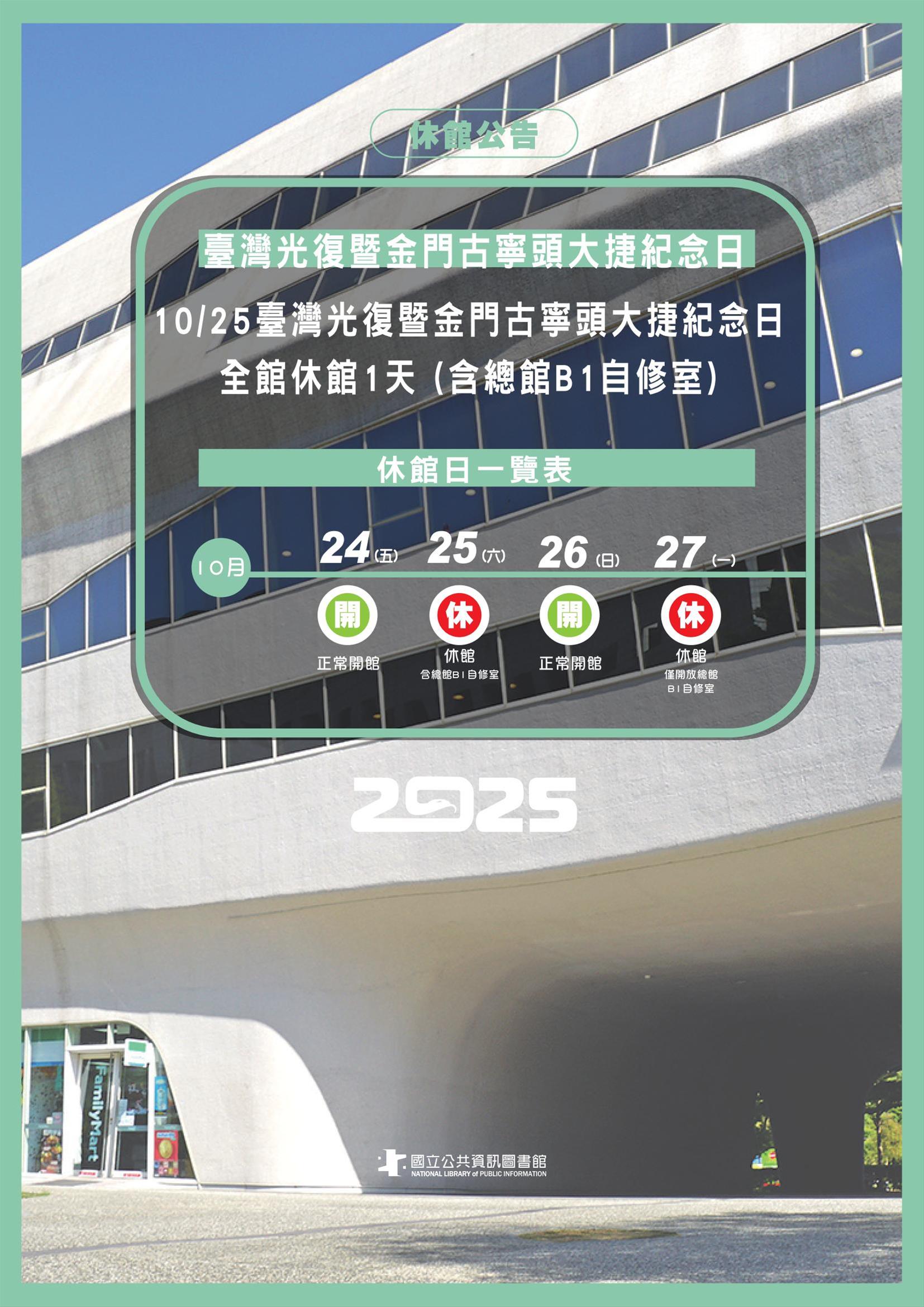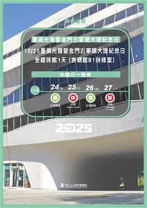 2025 臺灣光復曁金門古寧頭大捷紀念日 休館公告