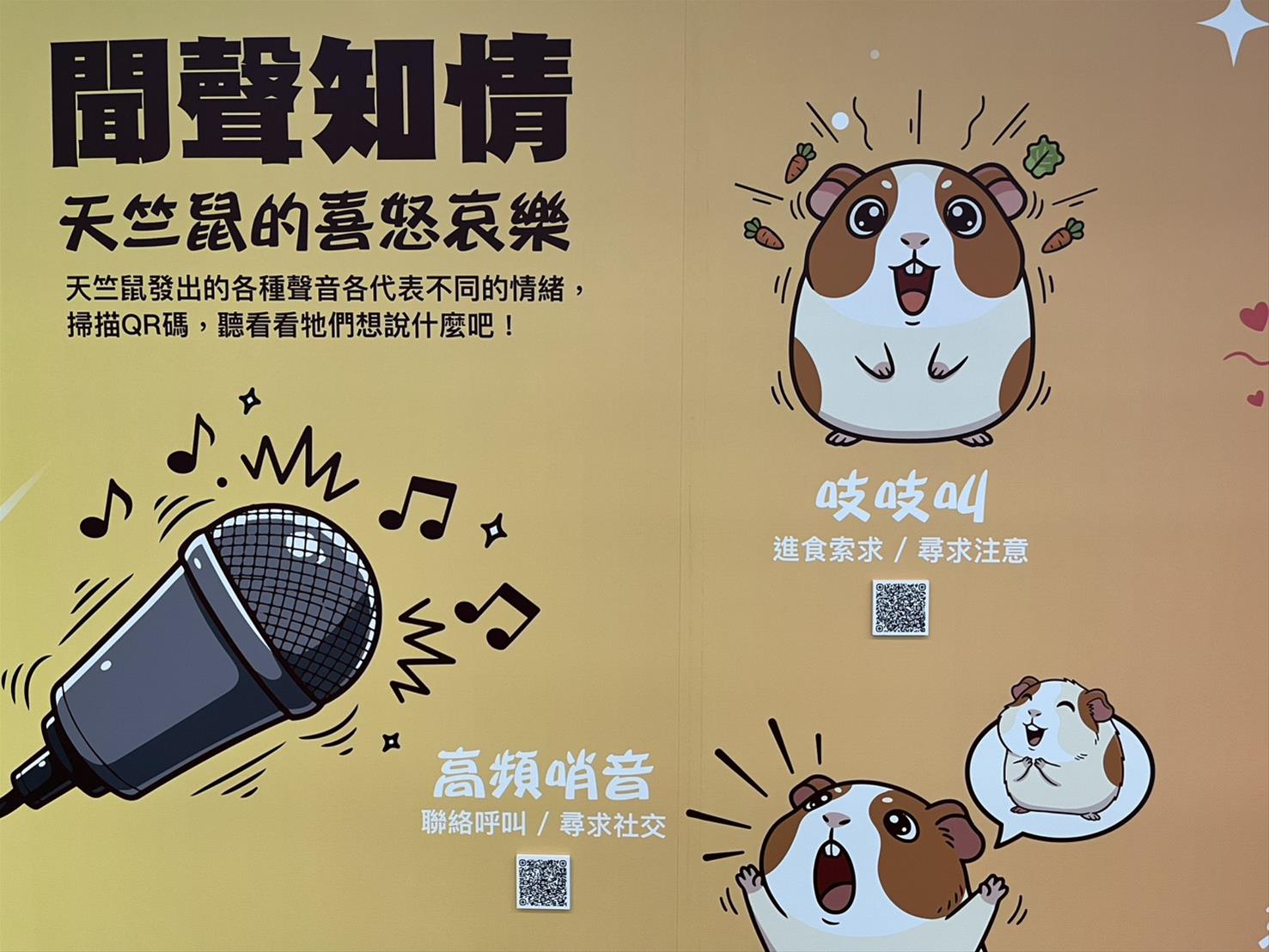 家中如有飼養毛小孩,是不是常覺得牠們會透過肢體語言或吠叫來引起注目,卻不知道牠們想表達什麼?科學家在照護實驗天竺鼠時也發現牠們常常在說話,而且聲音非常多彩多姿。為了聽懂牠們的「異國語言」,科學家開發了一套聲紋辨識系統:吱吱聲代表肚子餓了想吃東西,或是尋求同伴的注意;鳥鳴聲則是情緒極度緊張、異常興奮的狀態。本次特展中設有QR code,參展民眾可透過手機掃描不同叫聲的QR code,探究天竺鼠的心聲。