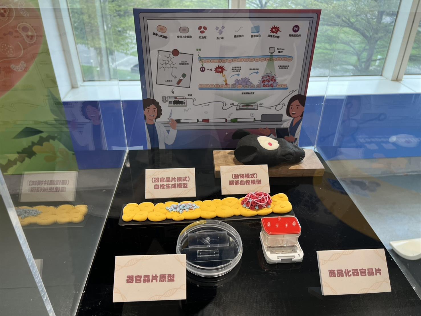 雖然實驗小鼠的基因構造與人類相近,但仍無法完全取代人體反應,且傳統細胞株試驗也難以精確模擬人類體內環境。科學家為了能夠更精準地模擬人體器官以及細胞接受藥物的影響,甚至是被疾病感染的狀態,開發出「器官晶片」的技術:在輕薄透明的特殊材質上,刻有微細的流道,在微流道上培養來自人體的不同細胞,模擬人體內不同的微環境,結合微控制系統模擬體內微環境,精準測試藥物或病原體對人體的影響。本次特展亮點「血栓晶片」,即是透過在器官晶片上培養血管的內皮細胞,並藉由雷射誘發產生血栓後,藉此觀察不同溶栓藥物的作用機制,展現生醫科技的精準進化。