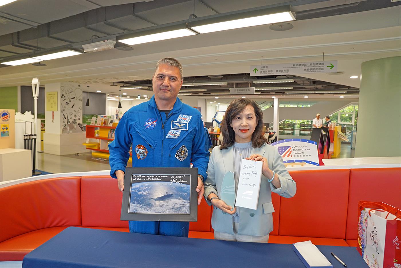 活動開始前,國資圖舉行了溫馨的禮物互贈儀式。林琪兒博士特別致贈一張他在太空任務期間,親手拍攝並親筆簽名的「臺灣空拍景象」照片給國資圖馬湘萍館長,象徵他與故鄉的連結;馬館長則回贈一份以美麗臺灣為外型的磁盤-臺灣盤,以此見證雙方友誼,並表達對於推動台美文化教育交流的重視。