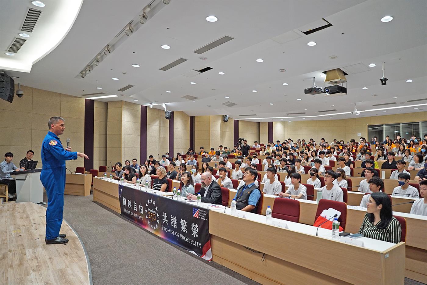 國立公共資訊圖書館於昨日(4月23日)攜手美國在台協會(AIT)美國資料中心及「自由 250」(Freedom 250)系列活動,舉辦「俯瞰地球天際:NASA太空人的視野」講座。國資圖首次邀請到NASA太空人林琪兒(Dr. Kjell Lindgren)博士到館與讀者分享探索太空經驗及他成為太空人的歷程,並由臺灣太空世代發展協會理事長王安隸擔任與談人,吸引眾多學子與與民眾參與,國資圖希望透過本次活動啟發更多學子探索科學、太空及追求夢想的熱情!