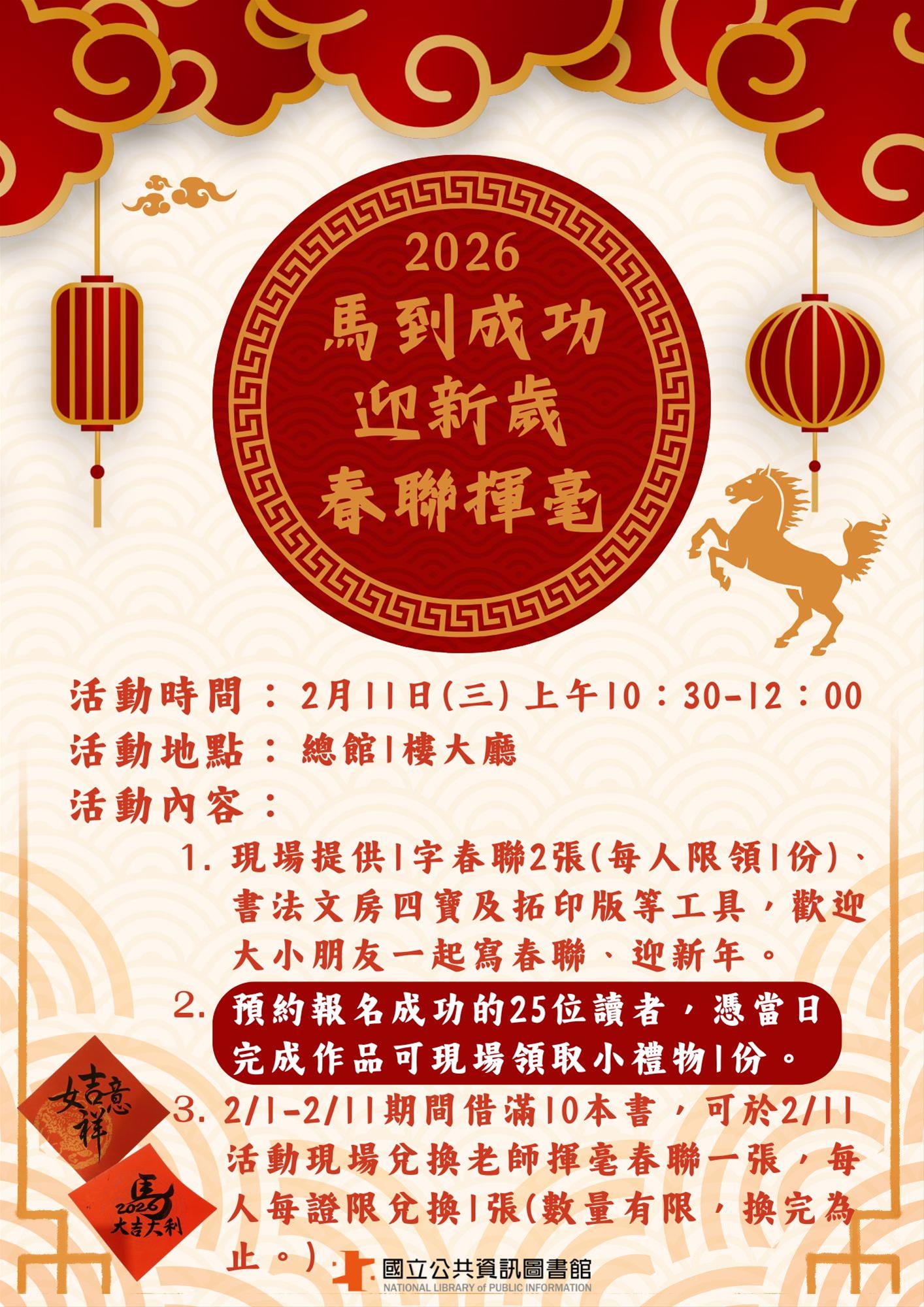 - 2/1-2/11期間借滿10本書📚,可於2/11活動現場兌換老師揮毫春聯1張,每人每證限兌換1張,數量有限,換完為止。