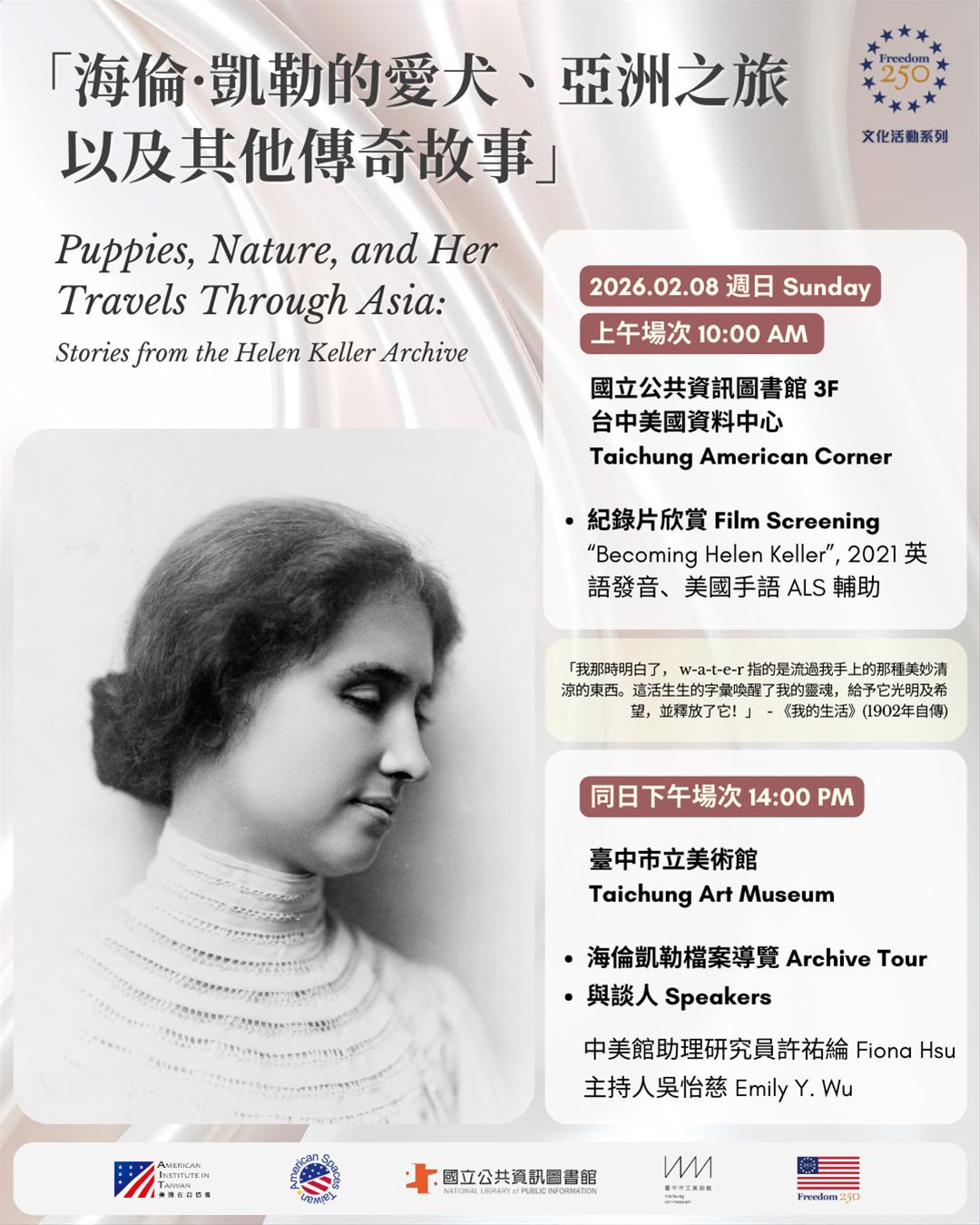 海倫·凱勒文獻已抵達臺灣!歡迎參加由美國資料中心主辦的第二場 Freedom 250 文化系列講座!