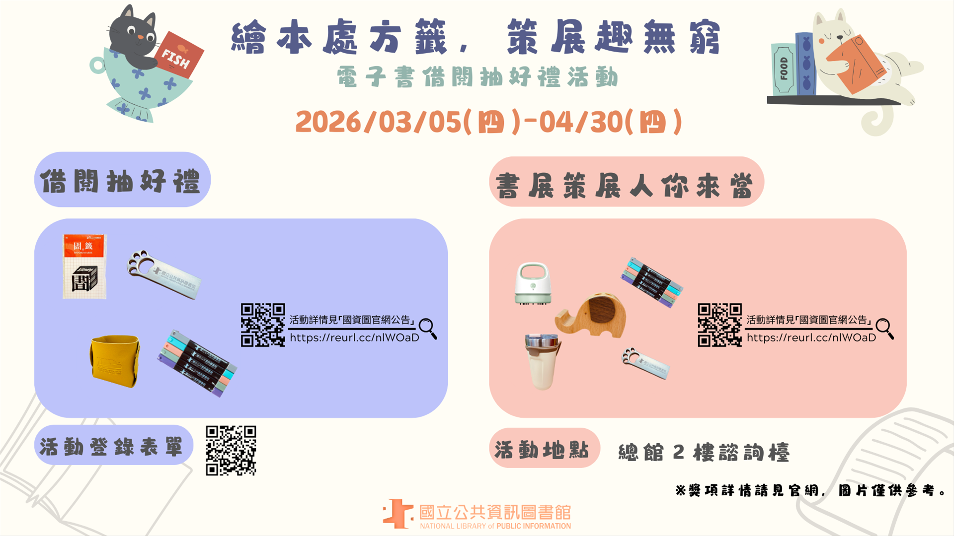 活動內容活動期間至本館電子書服務平台,累計借閱達40冊電子書(續借不計入),其中至少包含1冊「繪本處方籤-SEL情緒選書」主題書展書籍。填寫本活動登錄表單,即可參加抽獎。