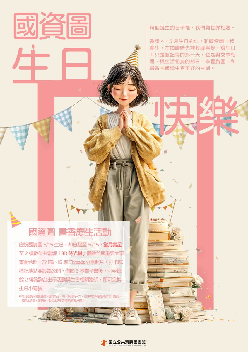 慶祝國資圖 5/15 生日,即日起至 5/15,當月壽星至 2 樓數位共創境「3D 時光機」體驗並與重要大事畫面合照,於 FB、IG 或 Threads 分享照片,打卡或標記地點並設為公開,借閱 3 本電子書後,可至總館 2 樓諮詢台出示活動與生日相關證明,即可兌換生日小福袋!
