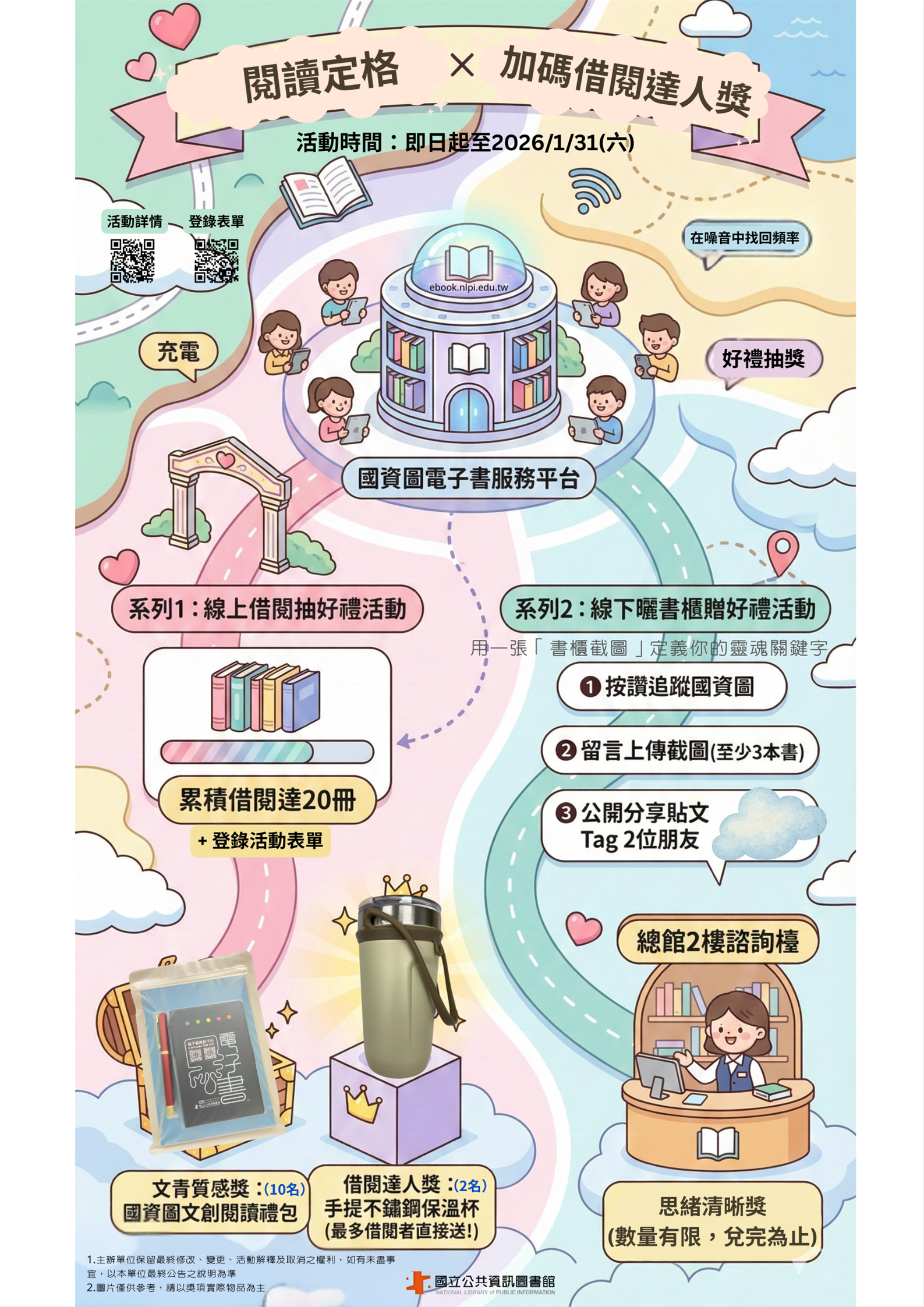 | 參加地點 | 本館電子書服務平台(連結) 本活動抽獎登錄表(連結) |