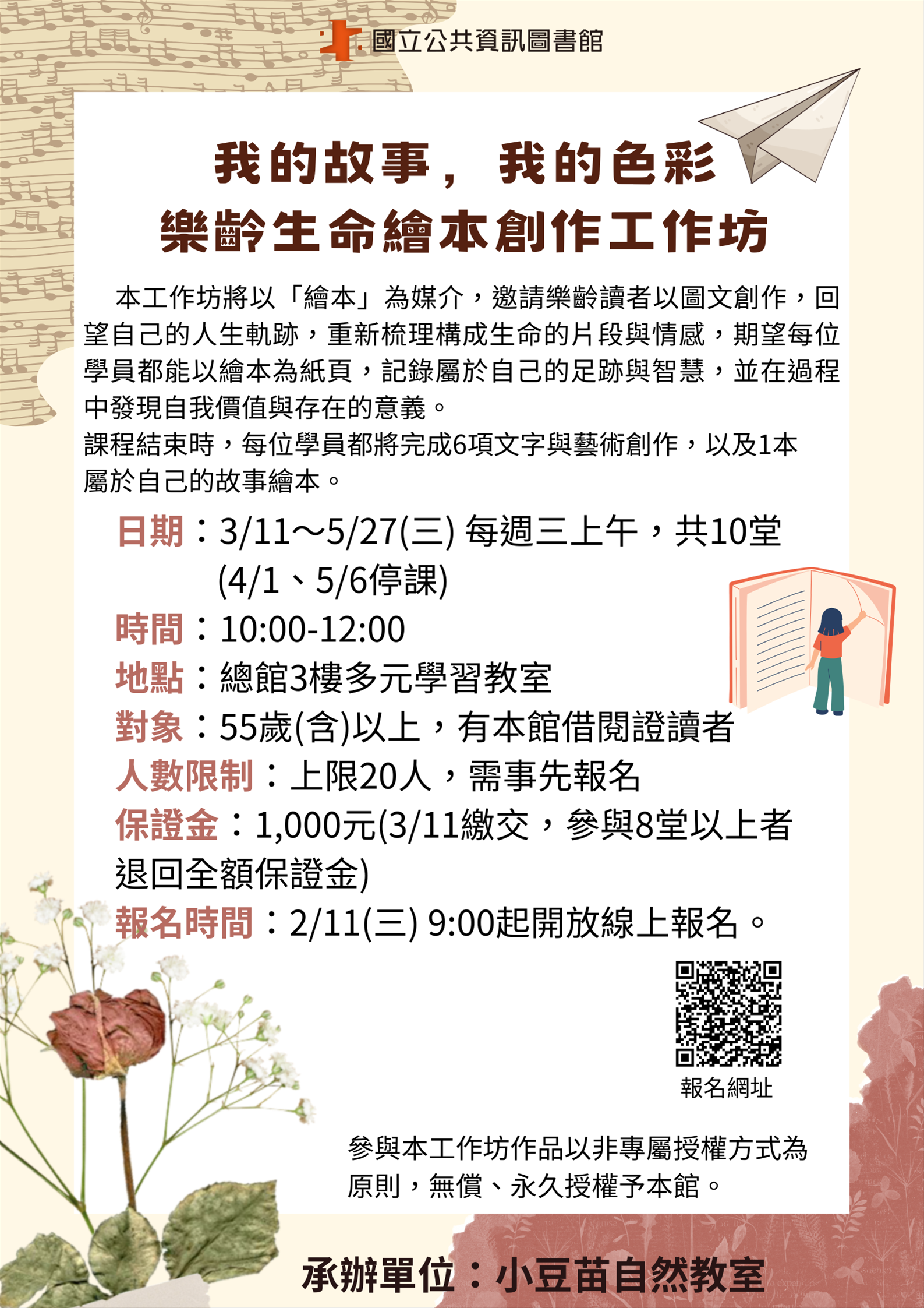 本工作坊將以「繪本」為媒介,邀請樂齡族以圖文創作,回望自己的人生軌跡,重新梳理構成生命的片段與情感,期望讓每位學員都能以繪本為紙頁,記錄屬於自己的足跡與智慧,並在過程中發現自我價值與存在的意義。
