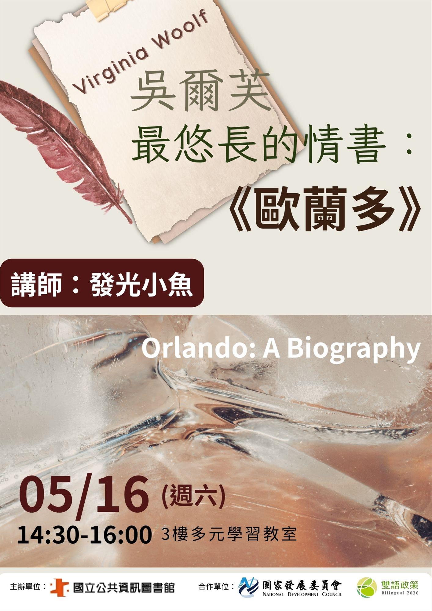 英國二十世紀最重要的女作家之一:維吉尼亞·吳爾芙(Virginia Woolf, 1882—1941),今年正好逝世85周年,代表作有《自己的房間》、《戴洛維夫人》、《燈塔行》等,呈現了她的女性主義主張以及文學成就。其中《歐蘭多》(Orlando: A Biography)又是其中最為人樂道者,主角跨越四百多年並且跨性別的經歷,不但是以意識流創作的女性主義小說,同時又與她一段隱密的戀情有關。這段過往是她婚姻的另一面,也是她作品複雜面相的另一成因。本次講座將透過《歐蘭多》一書,帶領大家了解吳爾芙鮮為人知的一面。