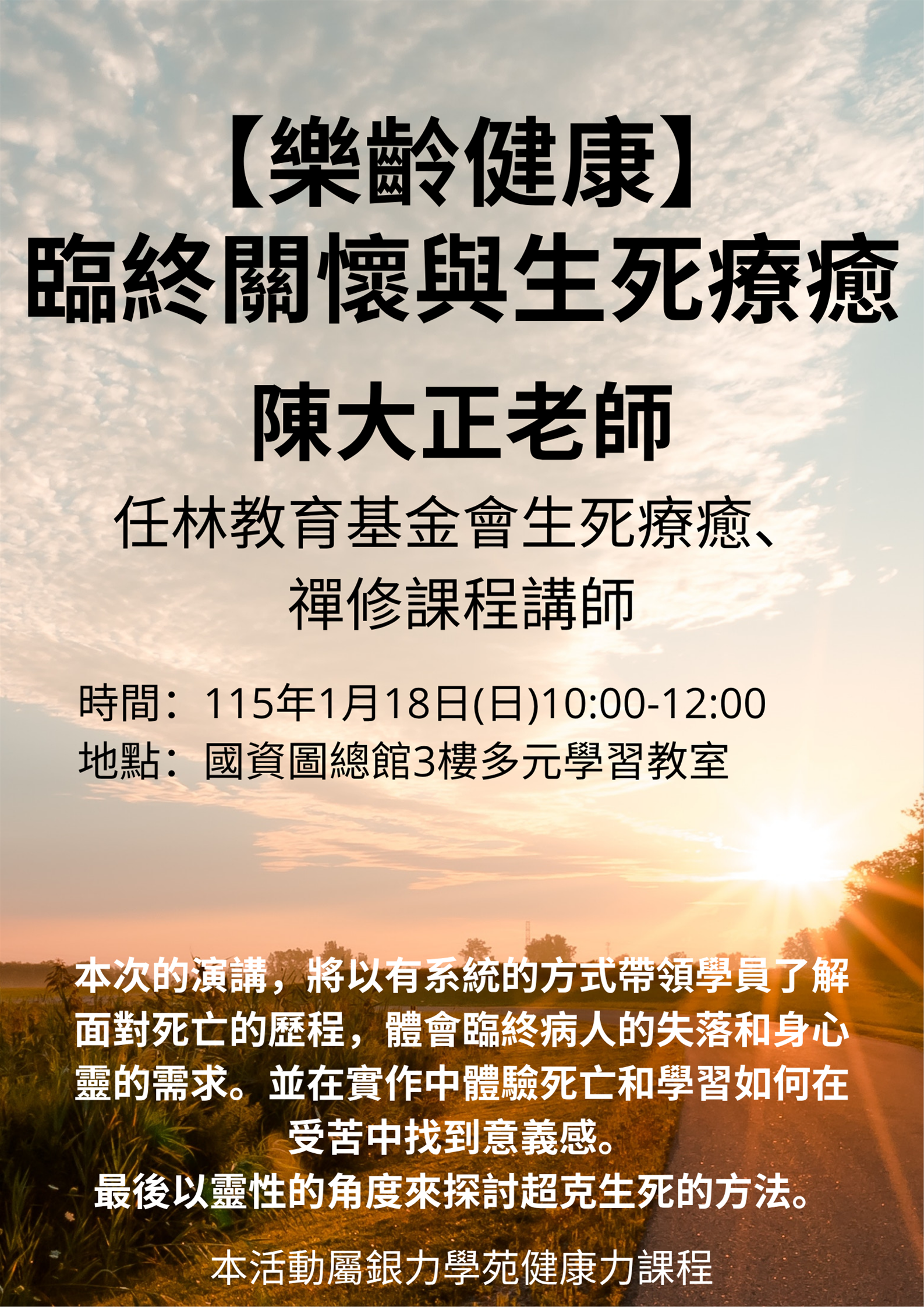生死大事一直是很多人害怕面對卻又畢竟會來臨的人生課題。當自己或重要他人死亡臨近時,如何與人生受限處境的議題-死亡共處,學習在面對終極議題時的情緒與失落,進而找到應對之道及做好準備,是每一個人都要學習的功課。