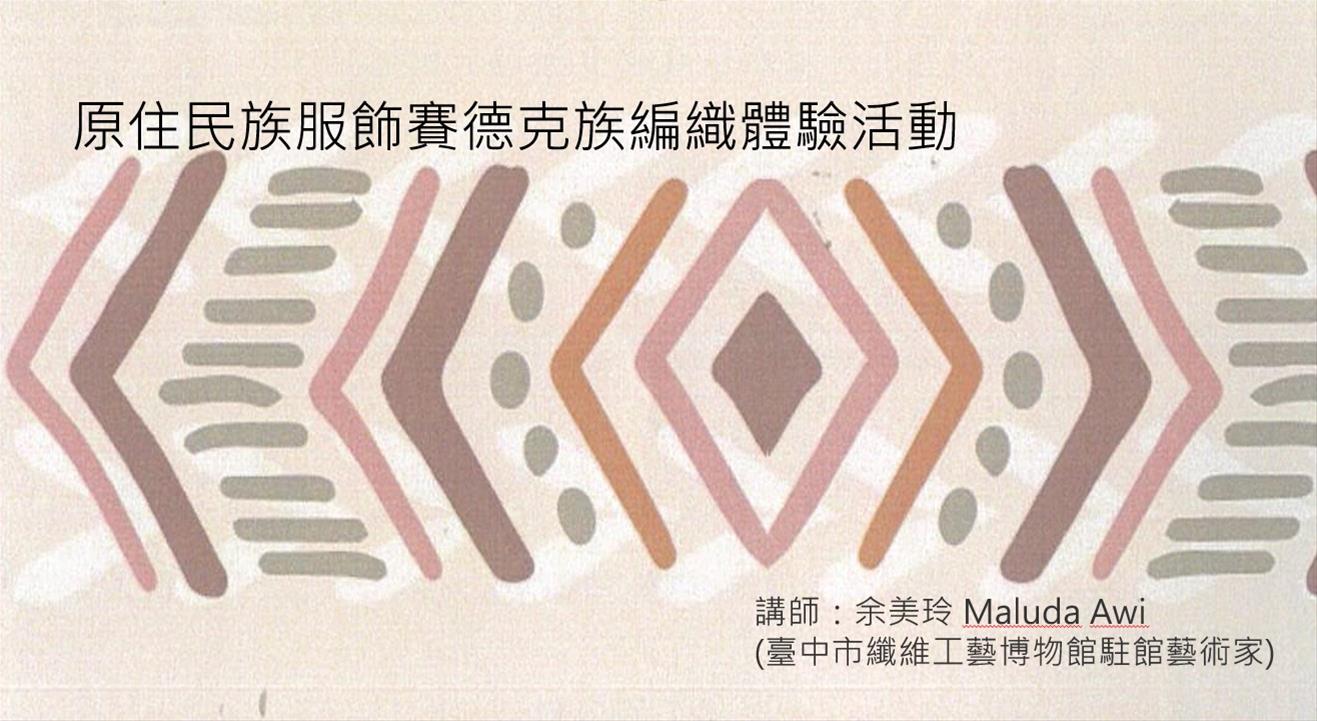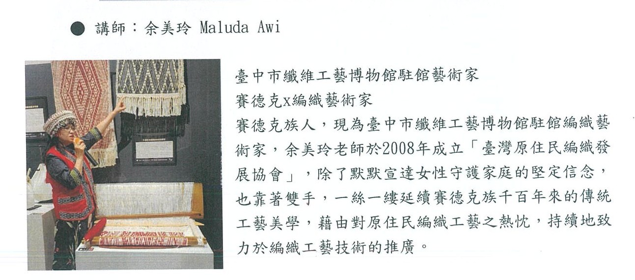 講師:余美玲 Maluda Awi(臺中市纖維工藝博物館駐館藝術家)活動時間:114年11月27日(四) 10:00-12:00
