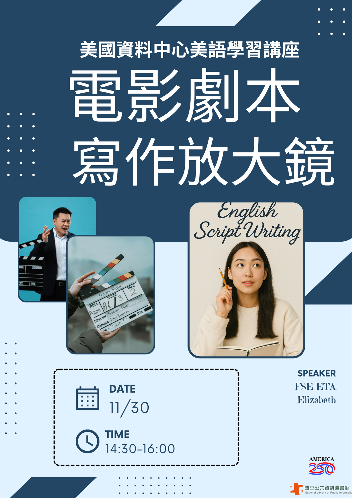 本館邀請Fulbright ETA Beth 介紹她專長的電影劇本寫作,以兩階段課程,帶領讀者從電影語言與結構入門,到實際創作對白與劇情發展。