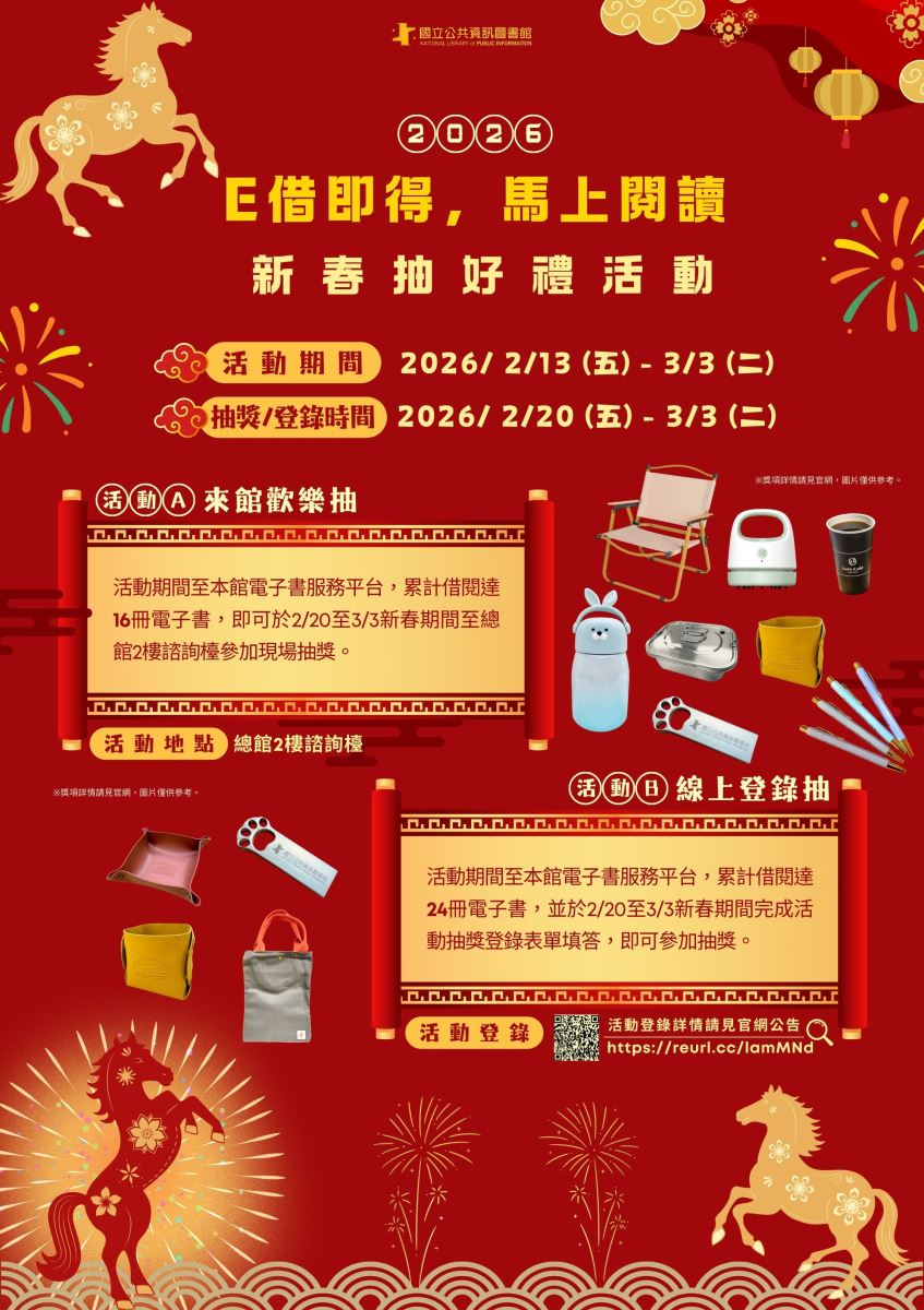 活動期間至本館電子書服務平台,累計借閱達16冊電子書(續借不計入),即可於2/20至3/3新春期間至本館2樓諮詢檯參加現場抽獎。