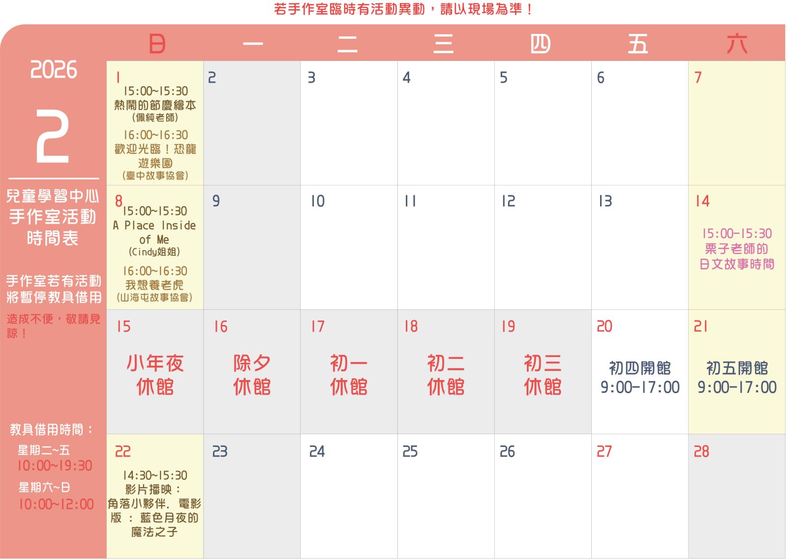 兒童學習中心活動時間請參考下表或可來電詢問。活動時間或內容若臨時有變,請以現場為準。