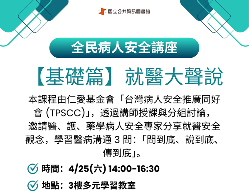 本課程由仁愛基金會「台灣病人安全推廣同好會 (TPSCC)」,透過講師授課與分組討論,邀請醫、護、藥學病人安全專家主講分享就醫安全觀念,學習醫病溝通 3 問:「問到底、說到底、傳到底」。