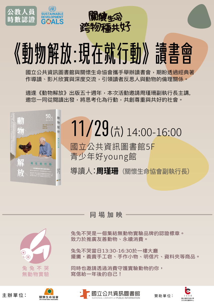 1975年,哲學家彼得.辛格出版《動物解放》,首度揭露「物種歧視」的倫理問題,為現代動物保護運動奠定基礎。2025年,適逢本書出版五十週年,關懷生命協會推出最終增訂版《動物解放:現在就行動》,並攜手國立公共資訊圖書館舉辦讀書會,邀請您一起思考人與動物的關係,將閱讀化為行動,實踐「跨物種共好」的理念。