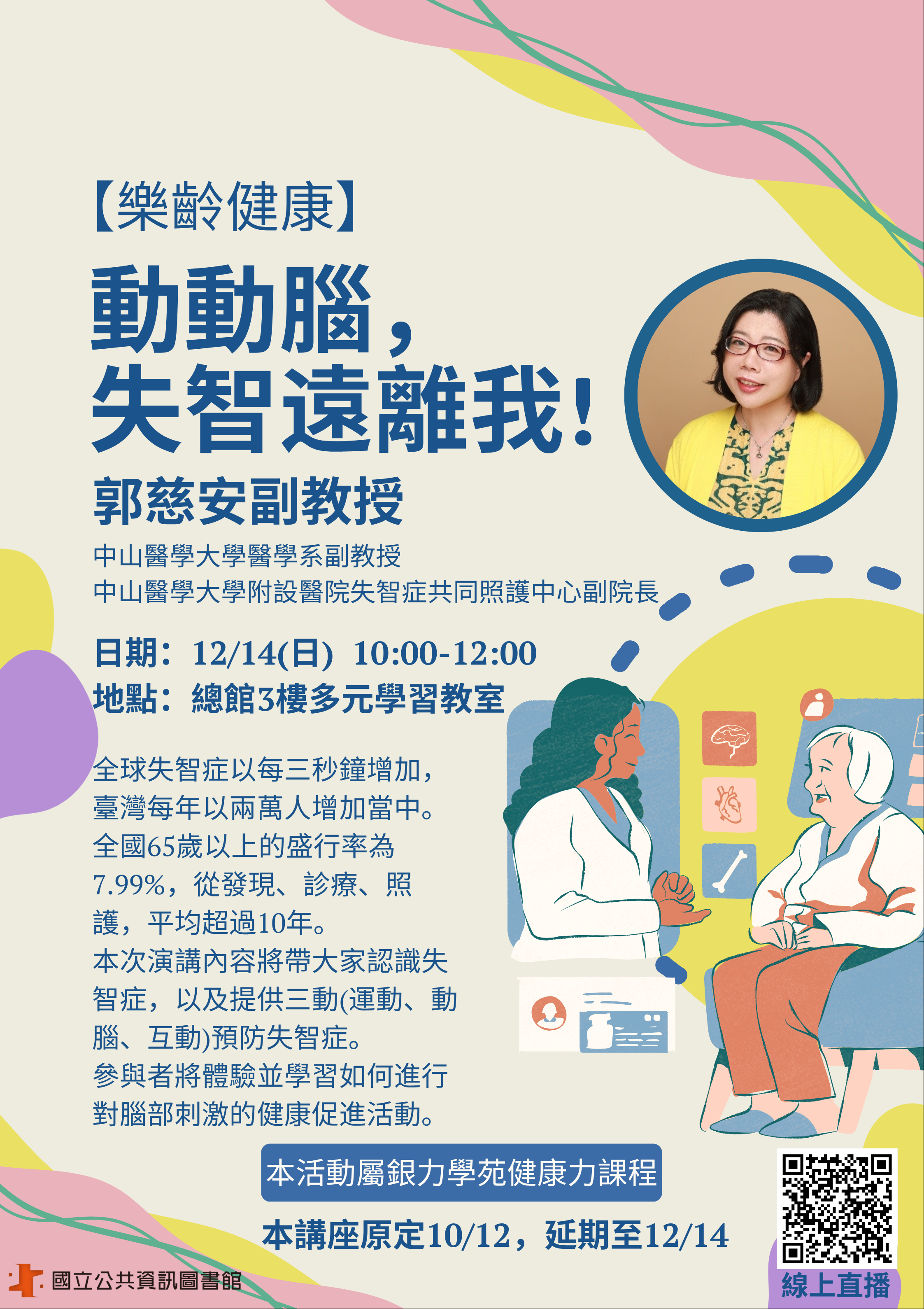 全球失智症以每三秒鐘增加,台灣每年以兩萬人增加當中。全國65歲以上的盛行率為7.99%,從發現、診療、照護,平均超過10年。因為一般大眾對於失智症的不了解,有太多與老化的過程或是老年心理症狀的混淆,因此不容易被發現。 而傳統上失智症以老年族群為主,但近年來因為壓力、生活型態與環境、生理因素或腦傷等因素,也出現年輕型失智症人口。因此,本次演講內容將讓大眾認識失智症,以及提供三動(運動、動腦、互動)預防失智症。參與者將體驗並學習如何進行對腦部刺激的健康促進活動。