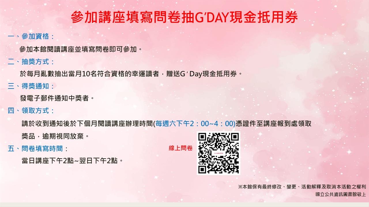 ※聽講座填問卷抽G’Day現金抵用券!來館聆聽講座並填寫線上問卷就可參加抽獎,趕快來參加!