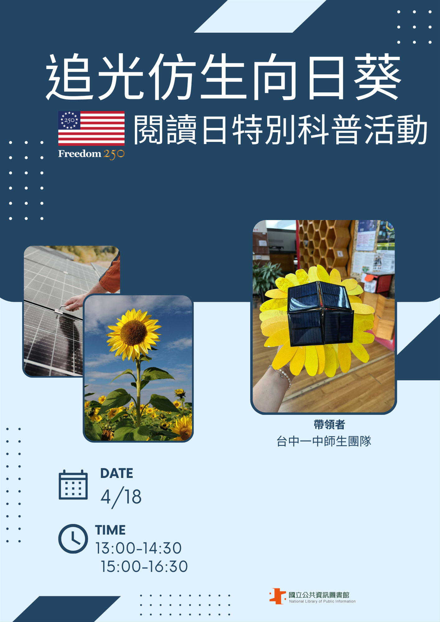 我們誠摯邀請大家來到國資圖,與我們一起利用太陽能板的特性,做出仿生追光的機械向日葵吧!