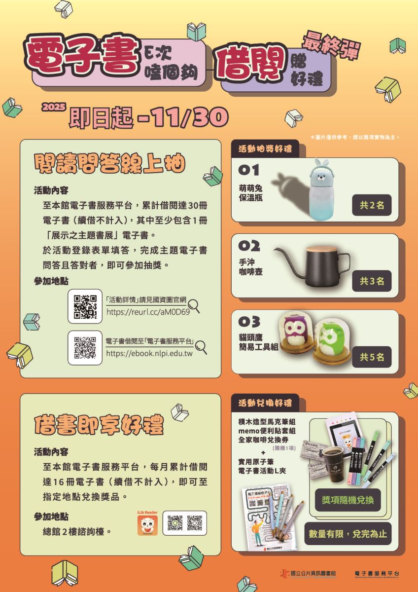 活動內容至本館電子書服務平台,每月累計借閱達16冊電子書(續借不計入),即可至指定地點兌換獎品。