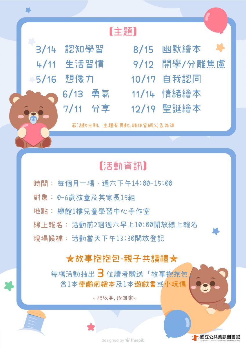 每場活動抽出3位讀者贈送「故事抱抱包」(含1本學齡前繪本及1本遊戲書或小玩偶)快來把故事,抱回家~