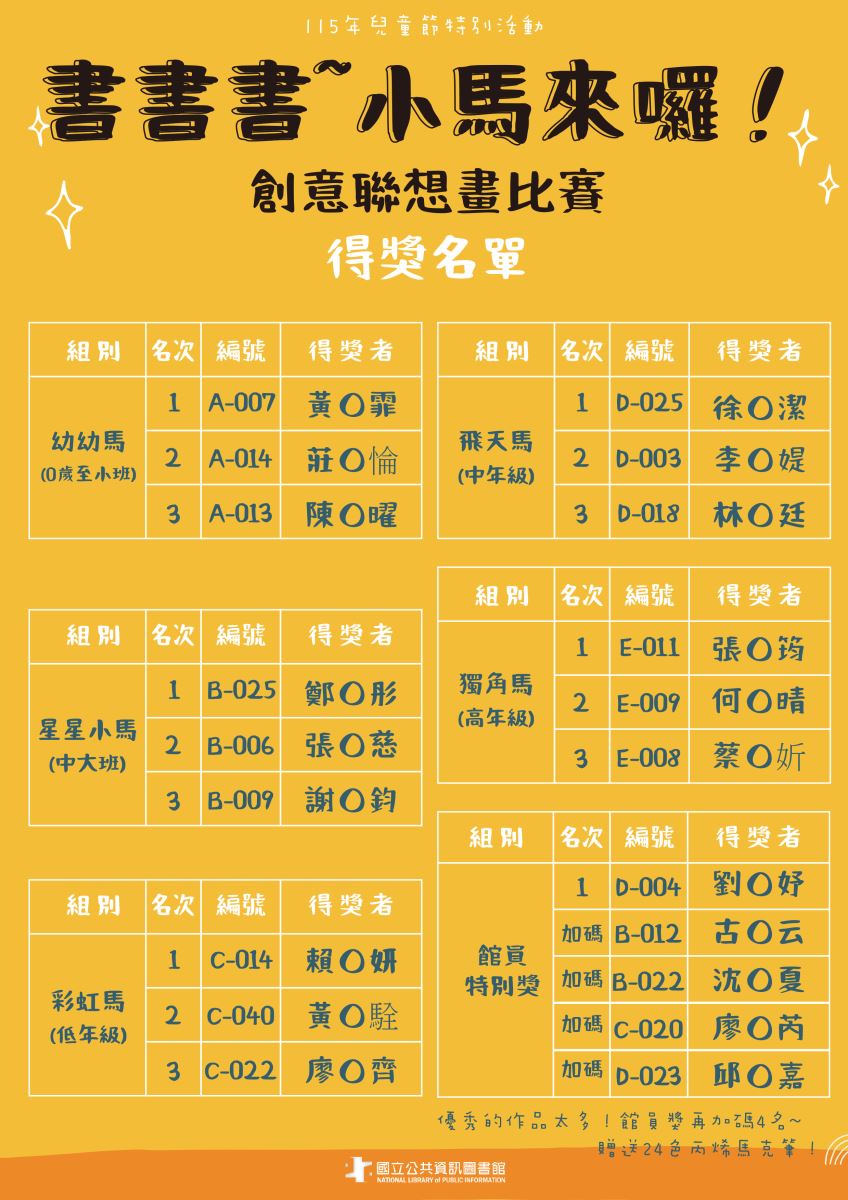 得獎作品將於4/21(二)~5/10(日)展示於兒童學習中心,並於5/12(二)起可取回。