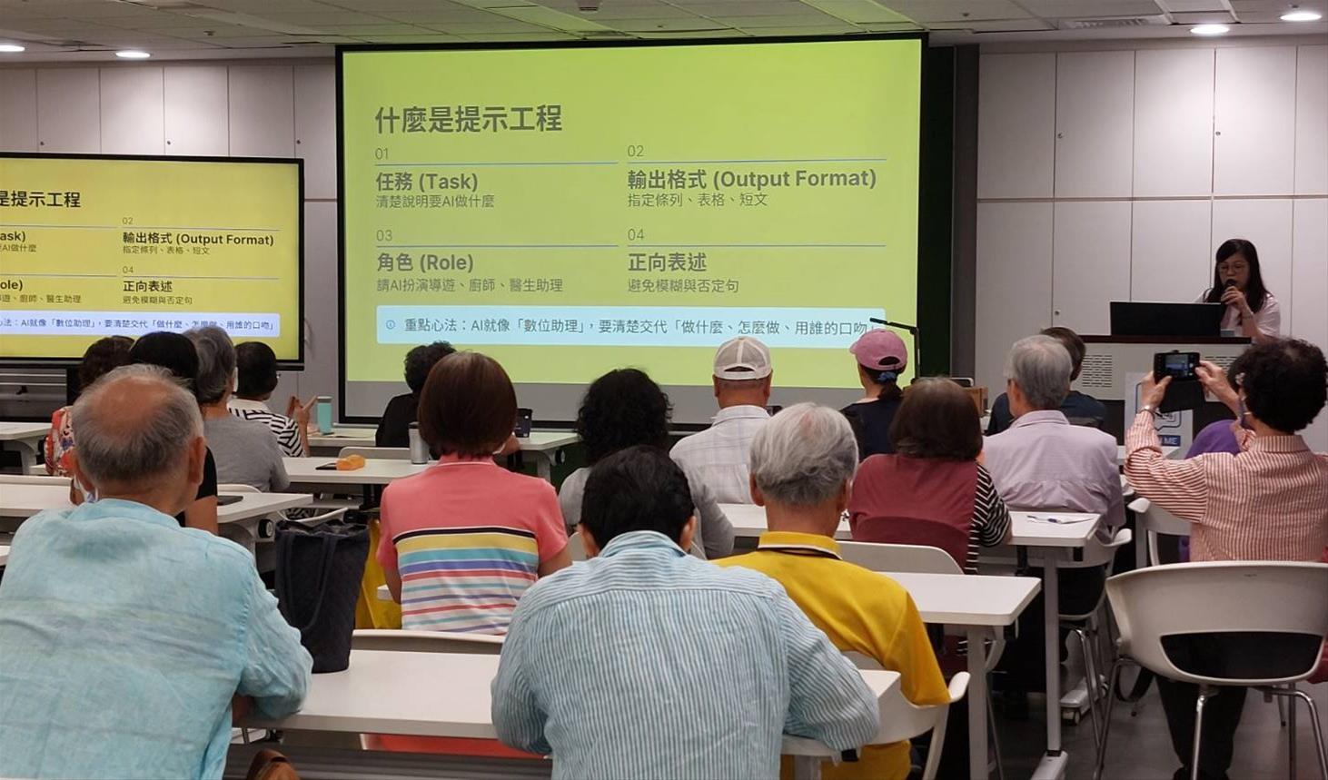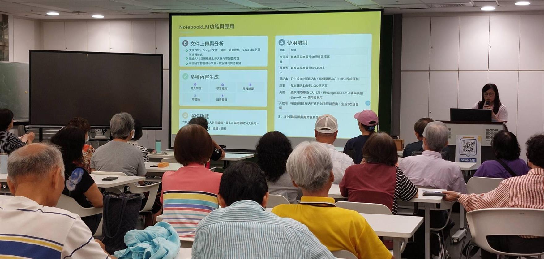 本次課程邀請國立空中大學管理資訊學系蕭惠玲講師,以生動淺顯的方式,帶領學員探索數位世界的便利與驚奇。蕭老師首先介紹了 AI 工具的共同價值,並提醒學員們在使用新科技時要抱持開放心態,培養持續學習與批判思考的能力。在實際介紹工具的過程中,老師精選了幾款工具,逐步帶領大家體驗。像是「NotebookLM」,能協助整理與分析大量文字資料,快速生成學習指南或常見問題,甚至轉化成語音報導;此外,「ChatGPT」與「Gemini」兩款智慧助理,老師也在課堂上現場示範如何活用,甚至製作最近流行的公仔模型圖片,引發大家的興趣。隨著課程在愉快氛圍中結束,學員們紛紛表示AI工具的使用非常有趣,不僅拓展了數位視野,也增添了學習新知的自信心。數位工具的技能學習,像是一場跨越年齡的數位探索之旅,讓樂齡世代看見科技帶來的無限可能。
