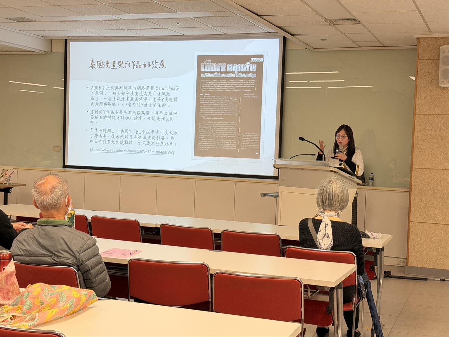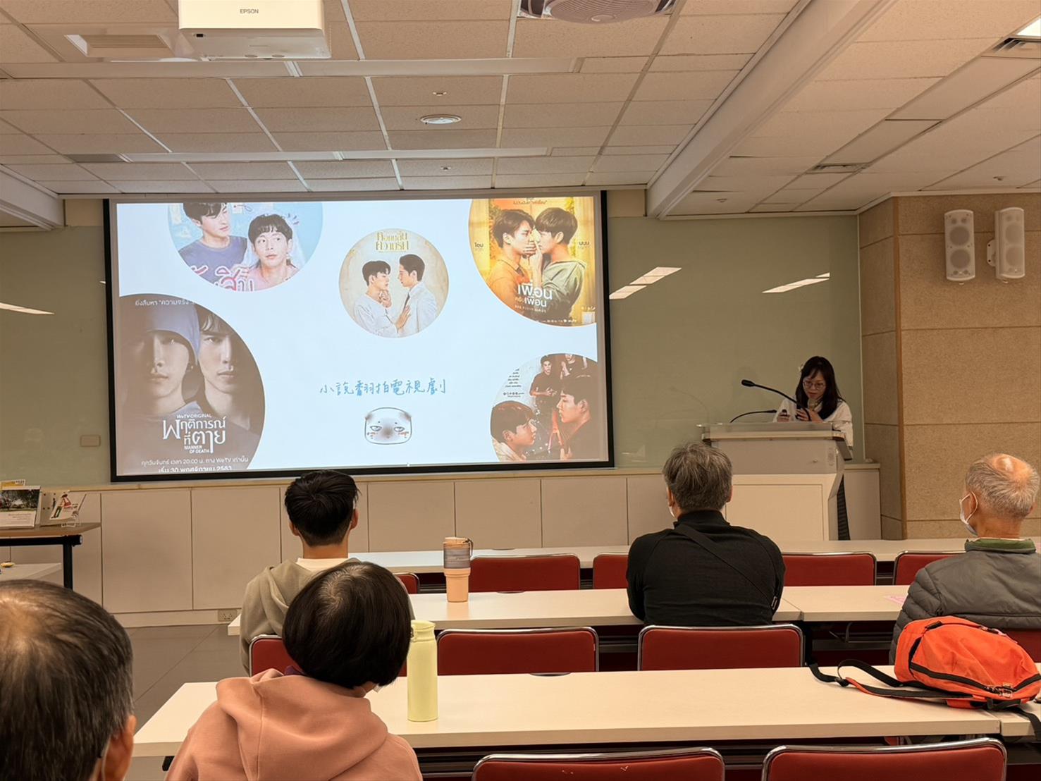 講座一開始,講師先釐清泰國文學中所謂的「Y 作品」概念,指出其指涉的是描寫同性別主角情感關係的創作,並可分為男男戀(yaoi)與女女戀(yuri)。然而在臺灣多以 BL 與 GL 稱呼,顯示不同文化圈在用語與接受方式上的差異。講師也特別強調,早期 BL 漫畫多將男男關係描寫為「超越性向的愛情」,而近年來的泰國 Y/BL 作品,已逐漸轉向更直接、清楚地呈現男性對男性的身心情感與認同,反映社會觀念的轉變。