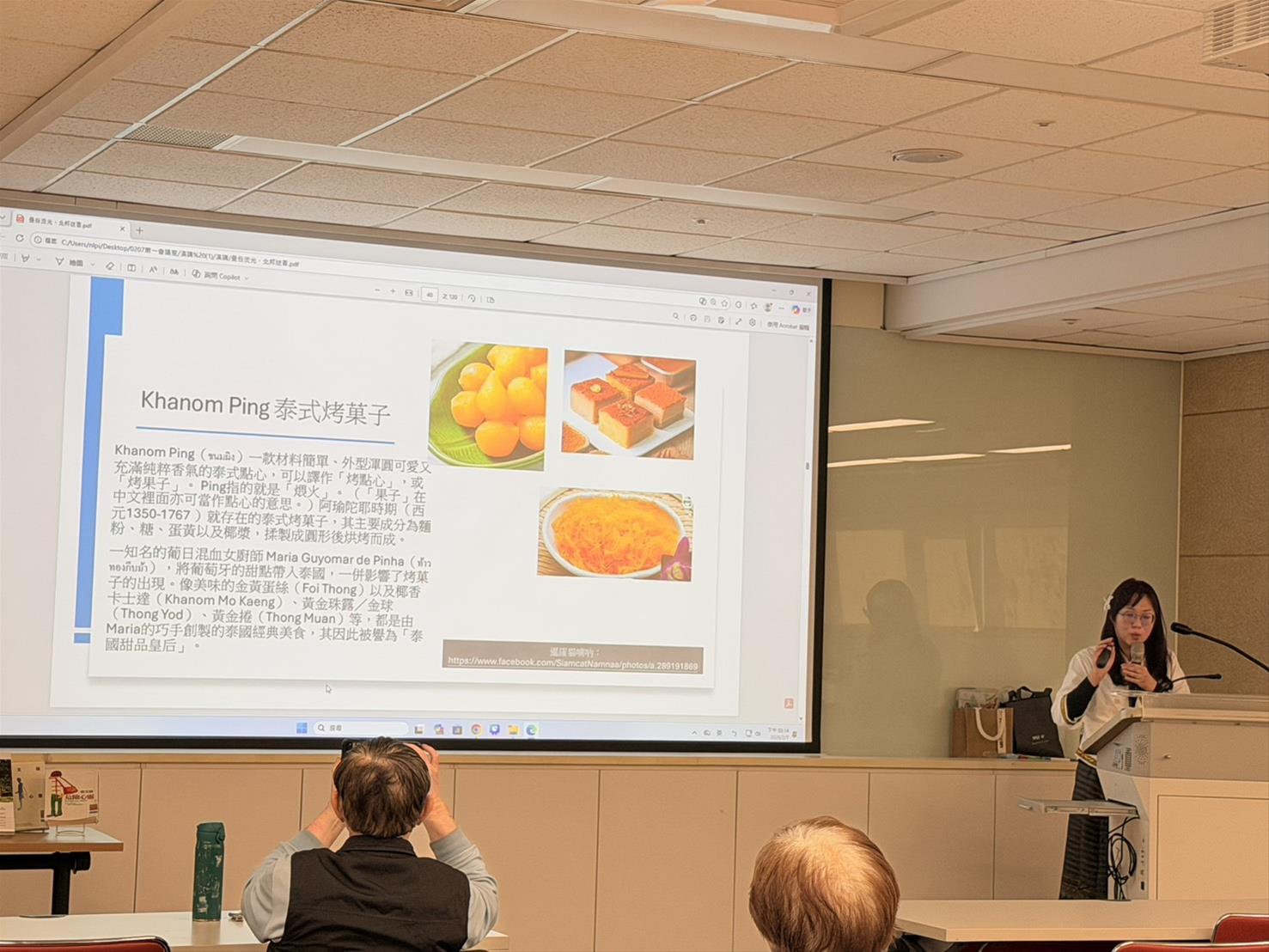 在文本分享部分,講師以自身翻譯的兩部作品為例,如何透過文學閱讀進入泰國文化的多重面向。第一本介紹的是《九月二十八號的死亡事件》,作者為 Varrvella。這部作品融合懸疑、靈異、推理與 BL 元素,在鋪陳故事主線的同時,也自然帶出泰國宗教信仰與日常飲食文化,例如泰式辣醬、Khanom Ping(泰式烤菓子)與椰漿咖哩什錦粥等,使讀者得以從飲食細節窺見泰國社會的生活紋理。
