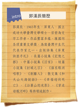 進入世新後,他加入了學校的洛城詩社,同時開始參加比賽,在周圍同學的眼裡,郭漢辰慢慢地有了詩人的身分,有一年參加了「鹽分地帶文學營」,上了葉 石濤等大師的課程後,自己的作品又在文學營裡拿到第二名,在大師的引領之下,等於為他開啟了文學的視野,「從此大概就離不開文學了」,郭漢辰說。