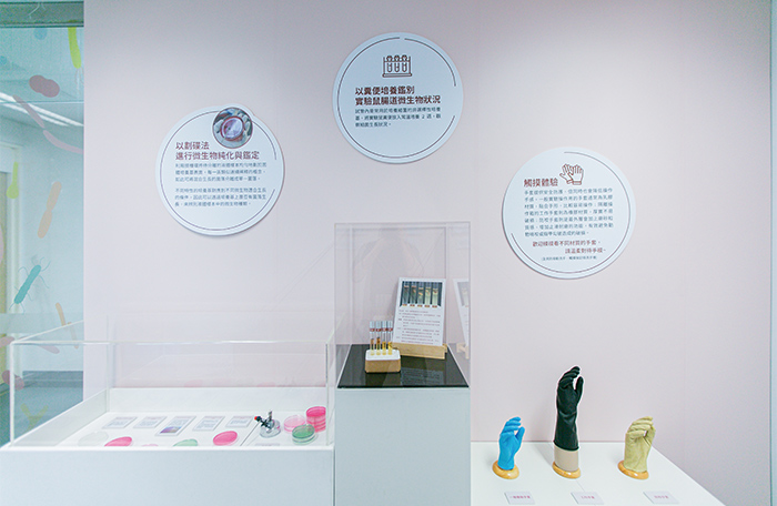此次的展覽,國研院動物中心除了在現場透過淺顯易懂的圖片和文字將研究概念進行科普化的介紹,同時也展示實際的無菌隔離操作箱,提供民眾觀展時可以親身體驗平日研究人員透過連接在無菌隔離操作箱本體的工作手套,為實驗鼠清理環境、放飼料等日常工作。