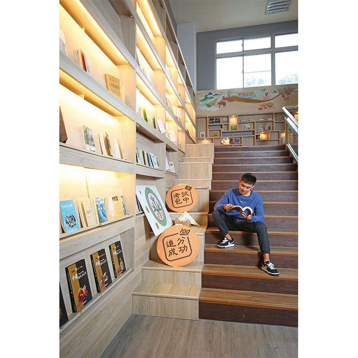 再往裡頭,就是分類清楚、排列整齊的書庫,連接著窗邊一排閱讀區,十分靜謐,經常有學生在這裡自習,也有老師來此批改作業。讀高二的楊艾家同學就說到,之前的圖書館沒那麼開闊明亮,也不會有主題圖書,改裝之後整個閱覽區變得氣氛輕鬆,而且經常有新書,所以只要有時間,她就會來找書,在共讀站閱讀,已變成她的休息時光。